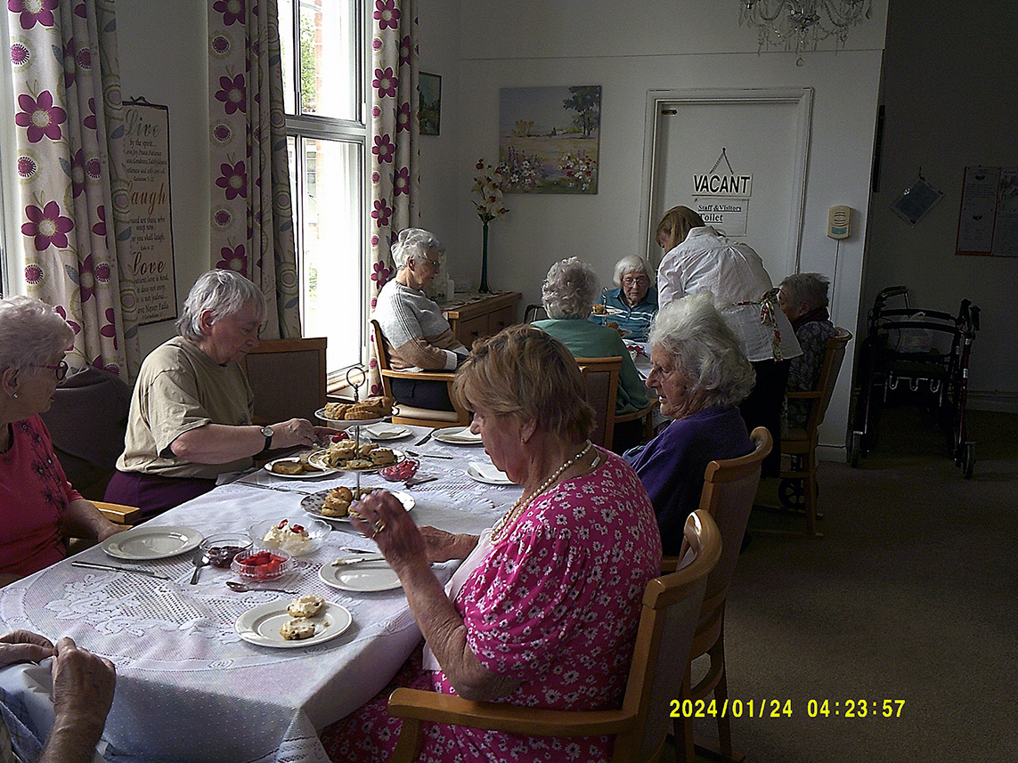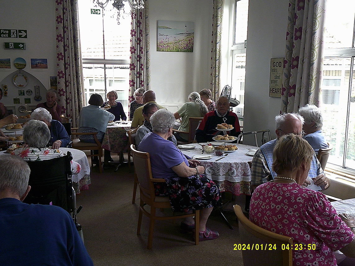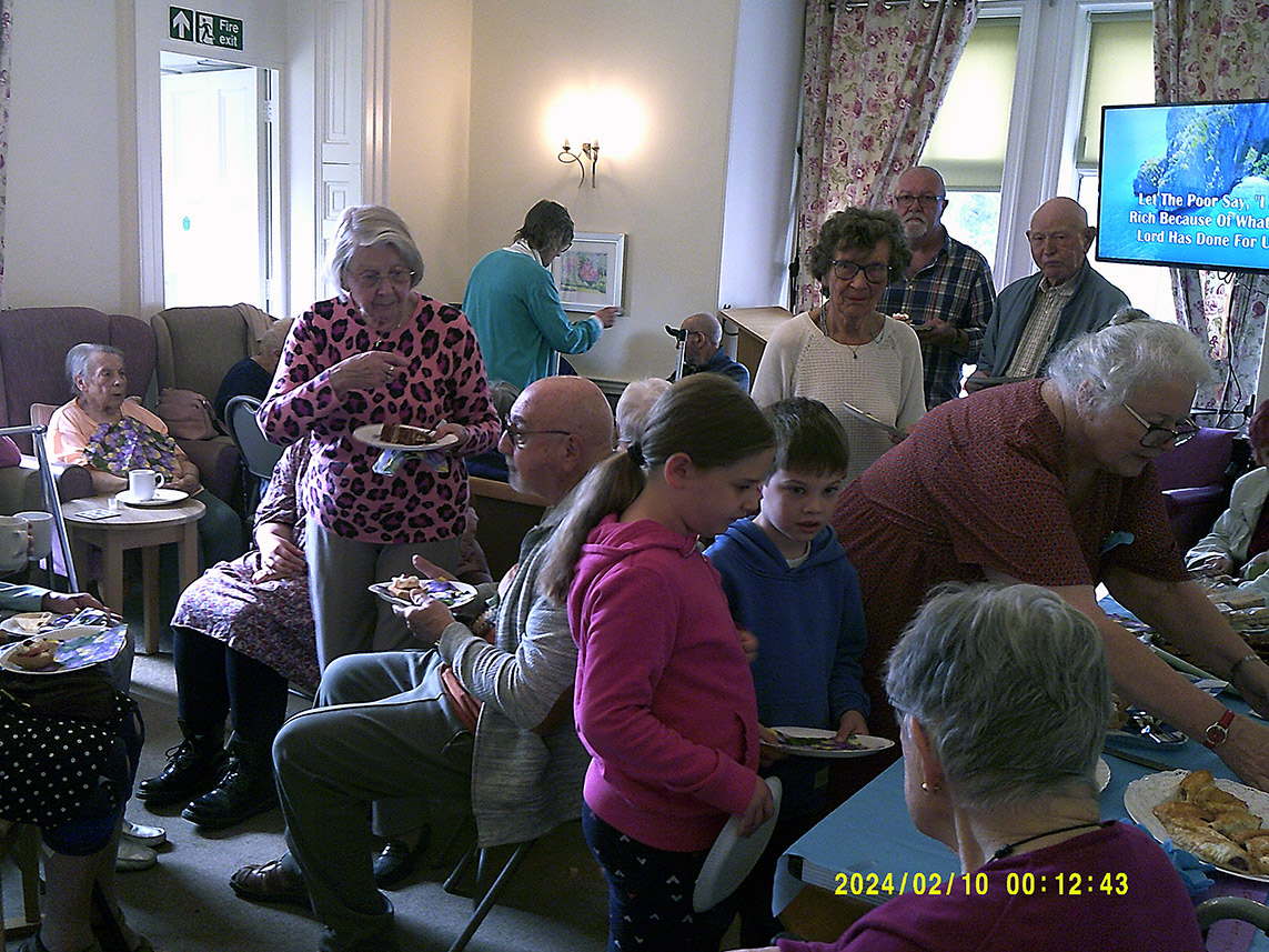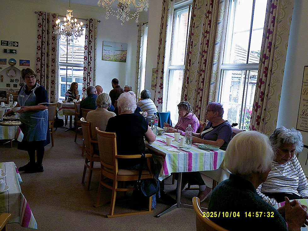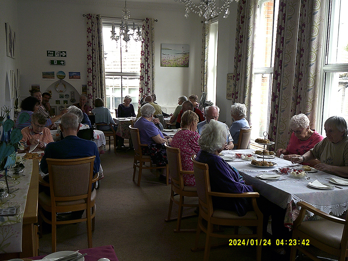 Due to the weather we decided to have the Cream Tea in the dining room. 61 guests had some very close fellowship in the dining room and a further 10 were in the downstairs lounge. As you can see we all enjoyed the scones and the atmosphere.