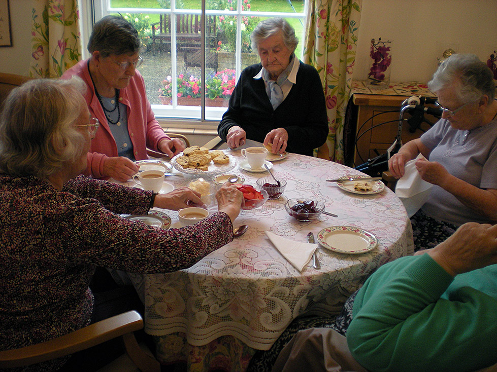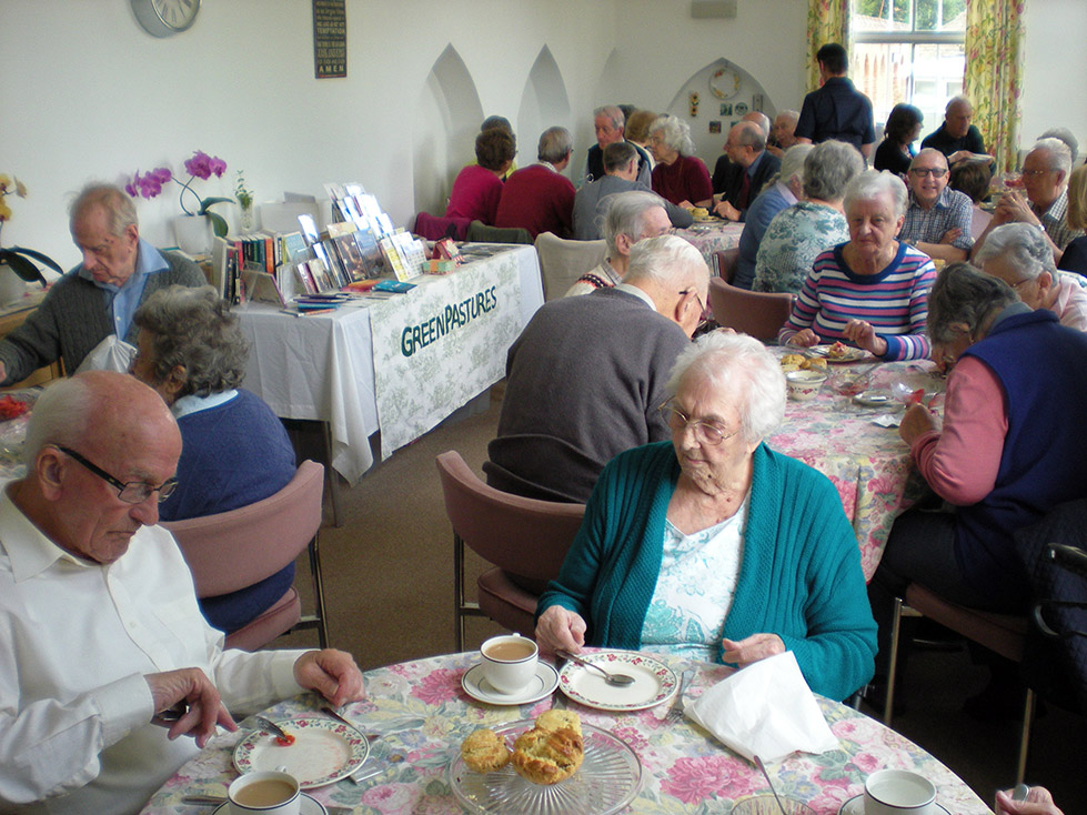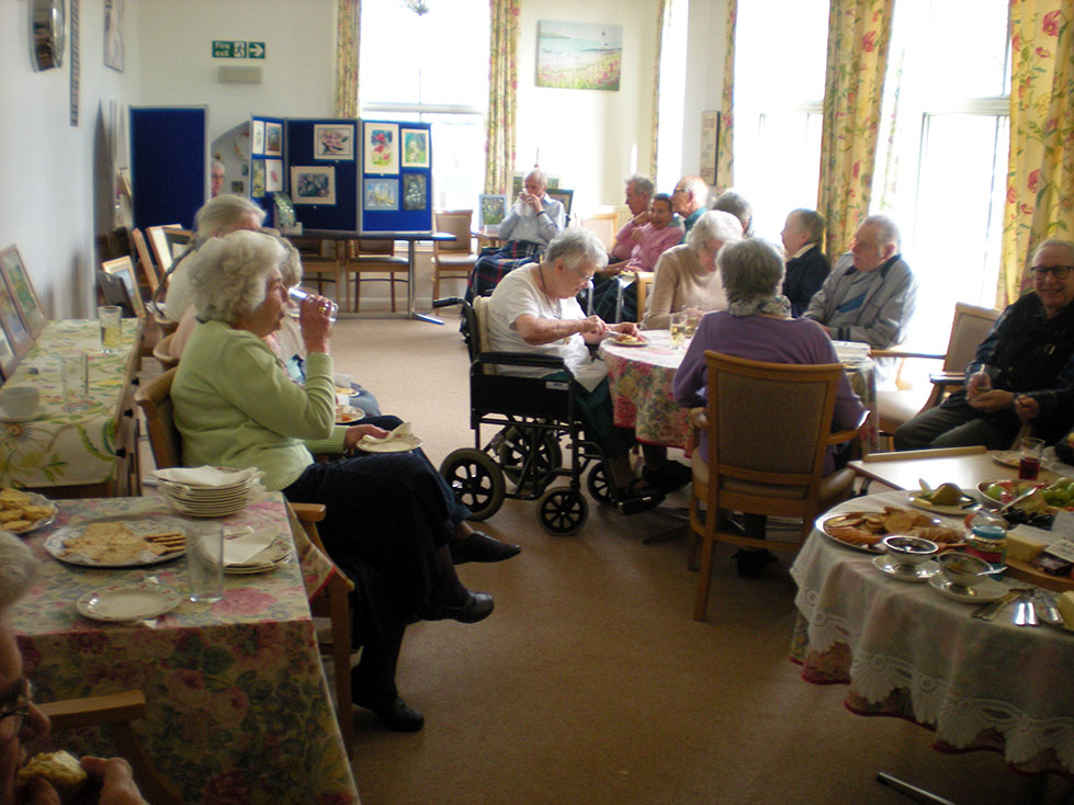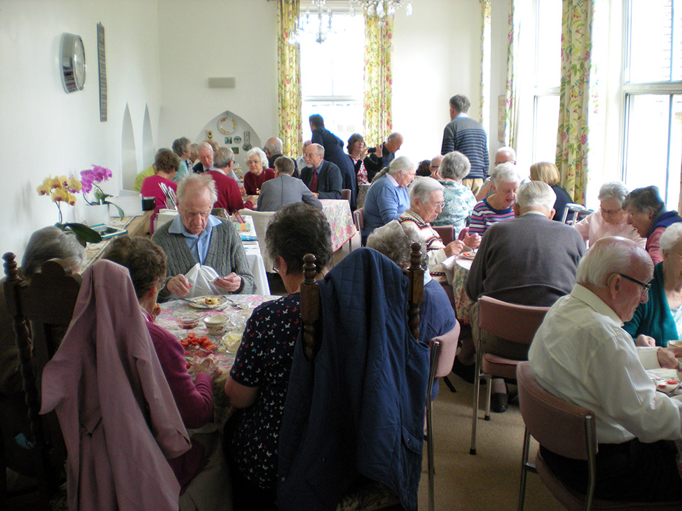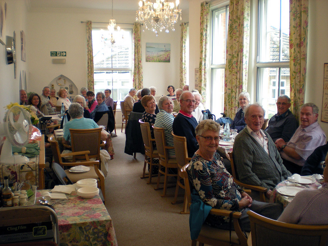 Due to the weather we decided to have the Cream Tea in the dining room. 61 guests had some very close fellowship in the dining room and a further 10 were in the downstairs lounge. As you can see we all enjoyed the scones and the atmosphere.